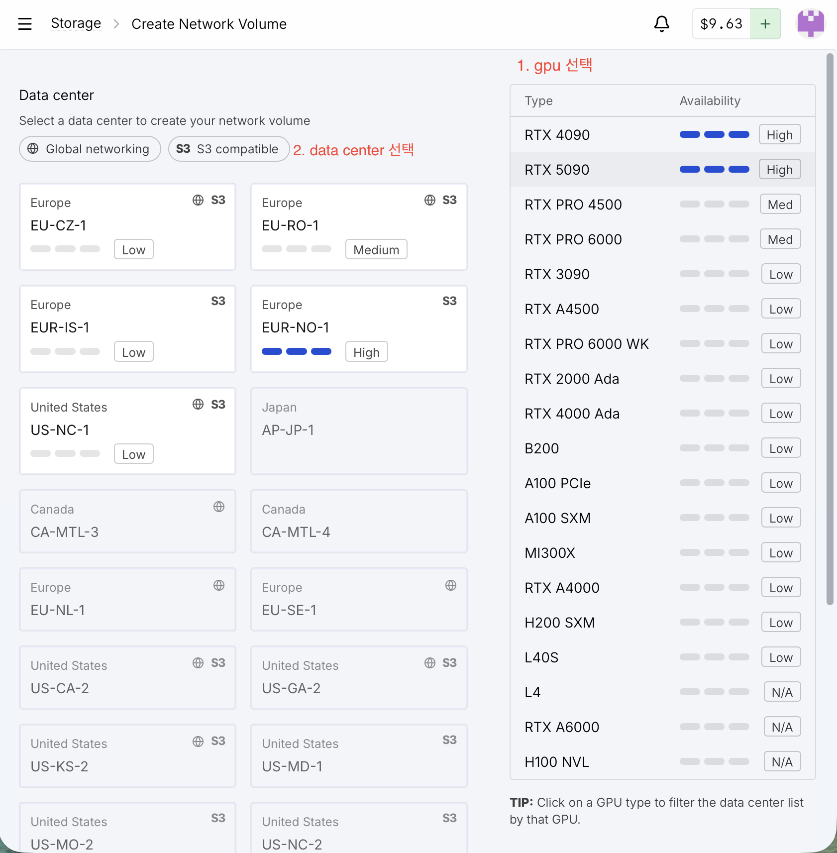 New Network Volume 누르고, 대여할 gpu 고르고 data center 고른다